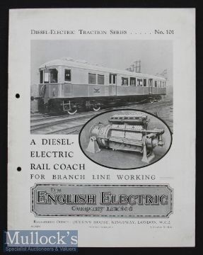 A Diesel Electric Rail Coach For Branch Line Working 1935 made by English Electric. A 12 page sales catalogue with 9 photographs of the Rail Coach^ and drawings of its engine. It had several months’ time table runs over three LMS branch lines^ could run up to 60 mph^ also pull a trailer coach. Size 8¼” × 10½”.