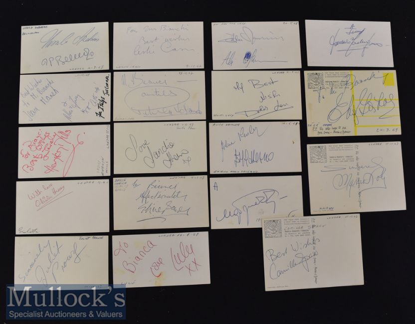 Assorted Selection of Entertainment Autographs to include Lulu^ Shirley Bassey^ Dalias Levy^ Juliet Prouse^ Ursula Andress^ Belmondo^ plus others^ collected at a restaurant^ mostly on the reverse of La Terreza London cards (18)