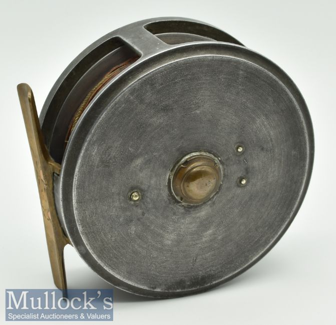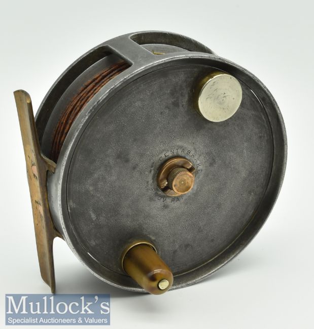 Rueben Heaton ‘Centabrake’ alloy Salmon Fly Reel 4.5” with counterbalance weight handle^ good smooth brass foot (slightly shortened to one end) constant check – c/w silk line – runs freely