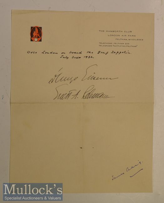 Capt. Ernst A Lehmann Signed Note – inscribed ‘Over London on board the Graf Zeppelin July 3rd 1932’^ with signatures below including Hugo Eckener^ Capt. Ernst A. Lehmann and James Craig Prime Minister of Northern Ireland (1921)^ on The Haworth Club London headed notepaper.