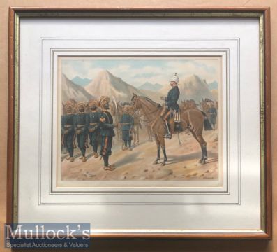 India - Original colour lithograph of a Sikh baggage train on the march escorting the 20th Punjab Bengal infantry field service kits^ N.W.F.P. c1900s by R Simkin. In original frame. Dimensions 42 x 36 cm