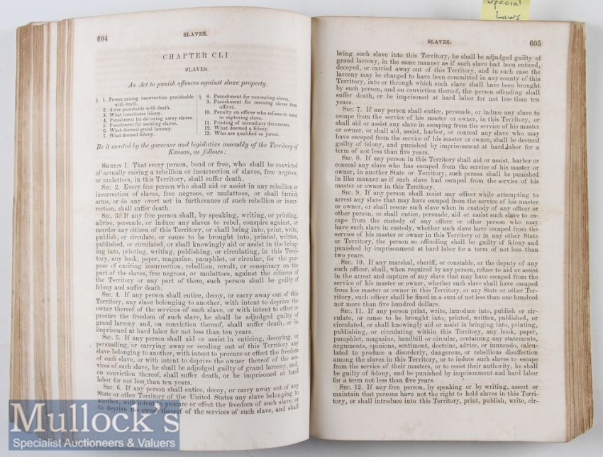 Americana – Laws of the Territory of Kansas 1856 Ex Doc^ Washington City pub^ by John T Brady^ consist of 169 chapters and 147 chapters of special laws^ including gaming^ jails^ jailors^ sheriff^ slaves^ dram shops^ crime and punishment etc^ this include pro slavery laws^ with Territory of Kansas Executive minutes 1856^ both in marbled wraps (2)