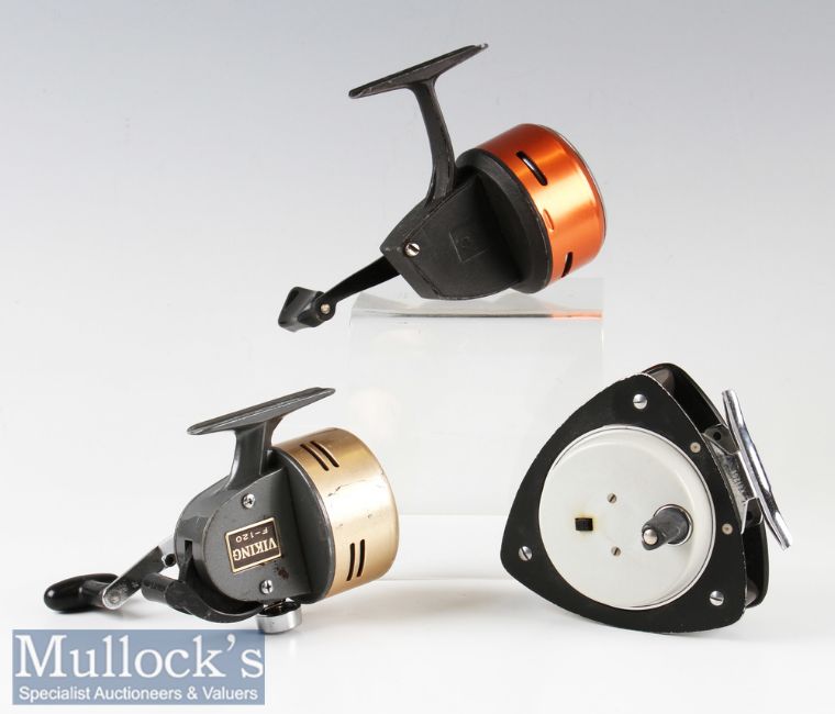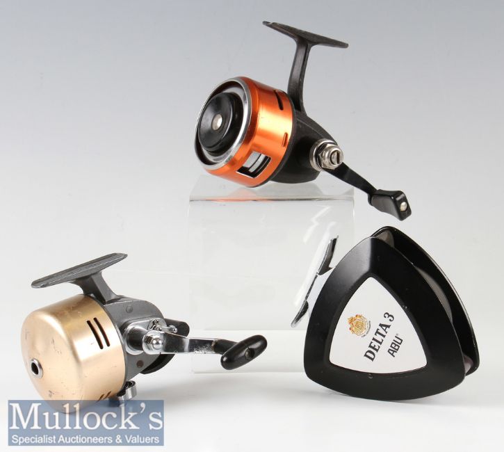 Abu Delta 3 alloy trout fly reel with quick release drum^ together with an Abu closed face reel with orange cover and a Viking F-120 closed face reel^ all in used condition with smooth movements. (3)