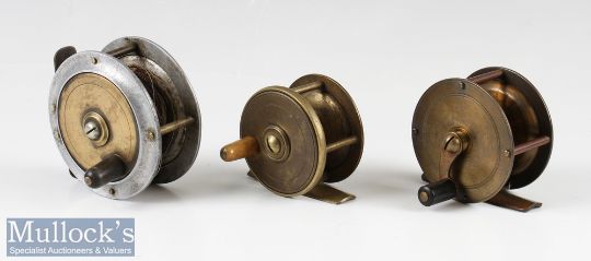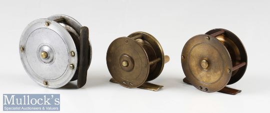 Early S Allcock 2 ¼” brass crank wind reel three pillar^ fixed check^ plus an unnamed 2” brass plate^ single shorn handled^ three pillar fixed check reel and a 2 ¾” unnamed brass and alloy reel with single black handle fixed check (3)