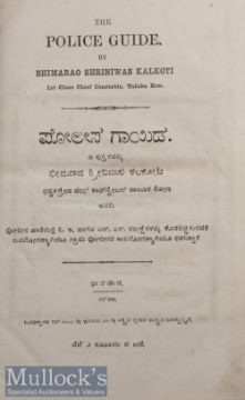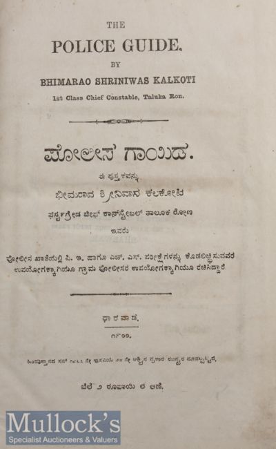 Scarce ‘The Police Guide’ Book by Bhimarao Shriniwas Kalkoti 1st Class Chief Constable^ Taluka Ron – dedicated to J B D Adams Esq.^ Late District Superintendent of Police^ Dharwar^ signed by the author with hand written letter expressing thanks and noting this to be the first copy of the book^ index appears with English translation^ remaining text is not in English^ bound in blue cloth