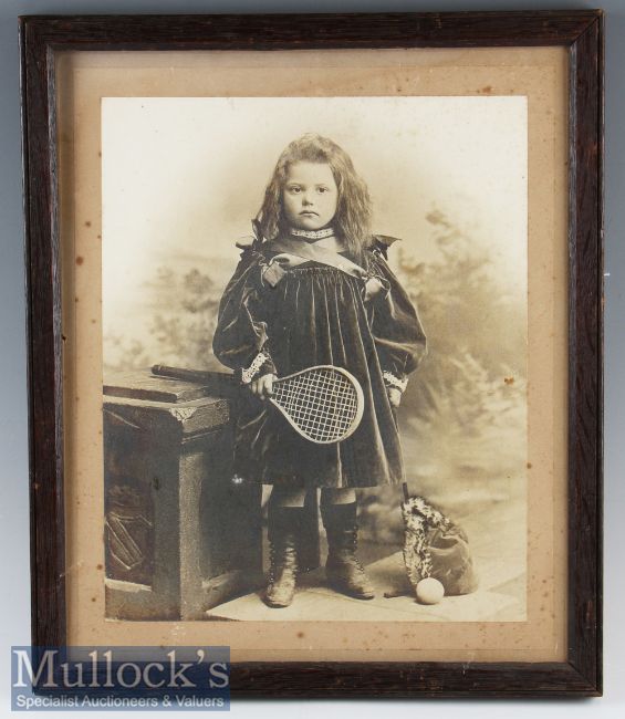 Early Tennis Photograph Depicting Little Girl holding Tennis Racket in frame measures 39x47cm approx. no glass