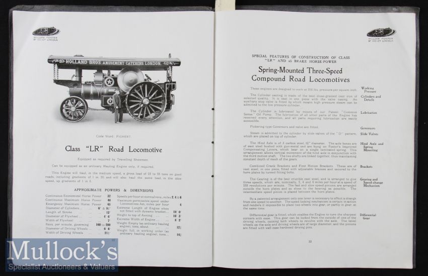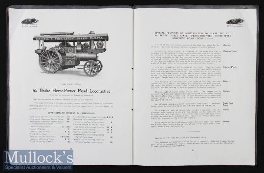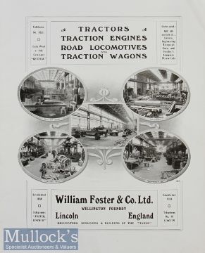 Automobilia - Traction Engines - William Foster & Co^ Lincoln. Circa early 1920s Trade Catalogue - a very impressive 44 page Trade Catalogue Detailing with 29 illustrations – The “Wellington” Compound Steam Tractor. 5 N.H.P. “Little Gem” Single Cylinder Agricultural Traction Engine. 6 N.H.P & 8 N.H.P Single Cylinder Agricultural Traction Engines. 5 N.H.P. Compound Three-Shaft General Purpose Traction Engine. 6^ 7 & 8 N.H.P. Compound General Purpose Traction Engine. A “LR” Road Locomotive (showing Holland Bros. Amusement Caterers^ London^ Engine). A 65 Brake Horse-Power Road Locomotive (showing Mitchel & Sons^ Latest Scenic Railway^ Engine). Two Straw-Burning Agricultural Traction Engine. Various Heavy Traction Wagons. Also with photographs of their Works. Printed on good quality gloss paper on card cover^ size 9” × 11½”.