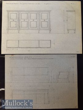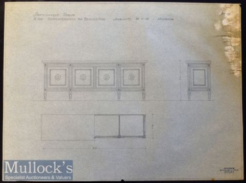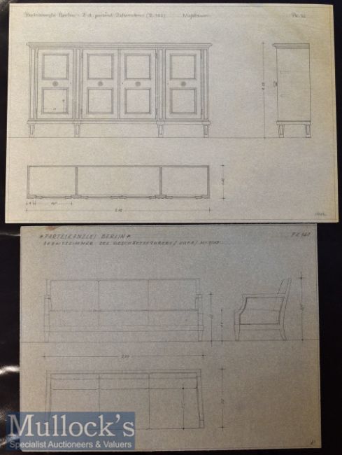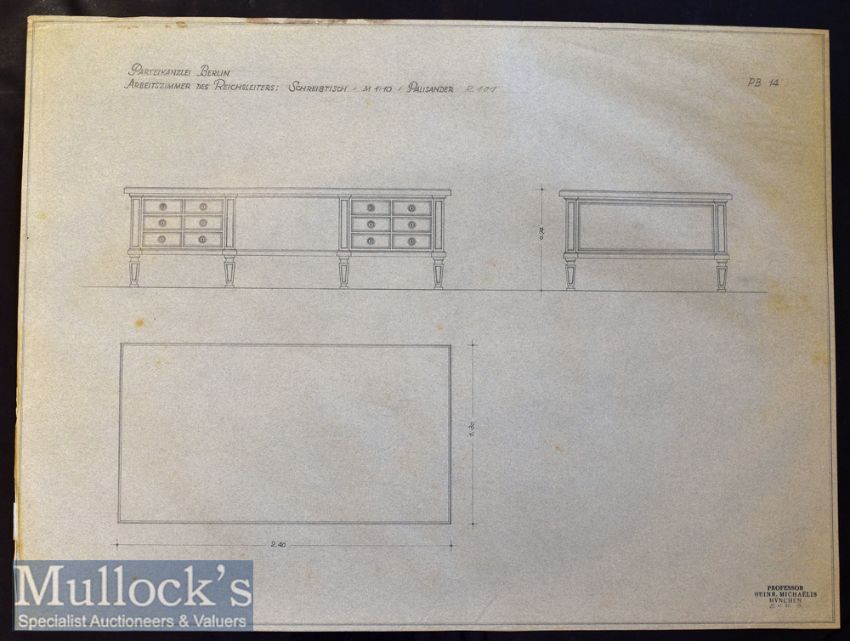 WWII – Adolf Hitler - Third Reich’s ‘Reich Chancellery’ Unique Collection of Professor Heinr. Micha?lis^ München Marked Original 1941-42 Interior Design Plans for the Third Reich’s ‘Reich Chancellery’ – the collection featuring various pieces of furniture and fittings. All plans entitled ‘Partei-Kanzlei^ Berlin’ [Party Office^ Berlin]^ most bear ‘Professor Heinr. Micha?lis^ München’ to bottom corner and consist of ‘Arbeitszimmer des Reichsleiters^ Sessel’ [Study of Reich Leader^ Armchair] PB17^ 1:1 scale^ measures 98x86cm approx.^ ‘Arbeitszimmer des Reichsleiters^ Schreibtisch’ [Study of Reich Leader^ Table with Marble Top] PB15 1:10 scale^ measures 60x45cm approx.^ ‘Arbeitszimmer des Reichsleiters^ Schreibtisch’ [Study of Reich Leader^ Writing Desk] PB14 1:10 scale^ measures 60x45cm approx.^ ‘Arbeitszimmer des Reichsleiters^ Schrank’[Study of Reich Leader^ Cabinet] PB10 1:10 scale^ measures 60x45cm approx.^ ‘Empfangszimmer des Reichsleiters^ Anrichte’ [Reception Room of Reich Leader^ Sideboard] PK88 1:10 scale^ measures 60x45cm approx.^ (marks to top left) ‘Empfangszimmer des Reichsleiters^ Wandtisch’ [Reception Room of Reich Leader^ Wall Table] PK91 1:10 scales measures 60x45cm approx.^ ‘Empfangszimmer des Reichsleiters^ Tisch’ [Reception Room of Reich Leader^ Table] PK90^ 1:10 scale^ measures 60x45cm approx.^ ‘Heizkörperverkleidung’ [Radiator Cover] PK56 1:10 scale^ measures 60x45cm approx.^ ‘Sitzungszimmer Runder Tisch’ [Meeting Room Round Table] PK93 1:10 scale^ measures 60x45cm approx. plus ‘Schreibtisch’ [Writing Desk] 1:10 scale measures 45x34cm approx.^ (tear 8cm long from left edge inwards) ‘Schrank’ [Cabinet] 1:10scale^ measures 45x34cm approx.^ ‘Schrank Rüsterholz ’ [Cabinet^ in Elm Wood] PK121 with ‘Rosette und Knopf’ [Rosette and Button] Door Knob PK121 measures 30x30cm^ ‘Arbeitszimmer des Geschäftsführers^ Sofa’ [Study of the Manager^ Sofa] PK141 1:10 scale^ measures 40x30cm approx.^ ‘Rosette und Knopf’ [Rosette and Button] Door Knob PK2 and PK10 1:1 scales^ measures 45x30cm approx.^ and another ‘Persönl Referenten’ [Cabinet] PK36 measures 45x30cm approx. Hand Drawn in pencil on tracing paper. Overall condition appears very good^ some small tears to edges in places^ other conditions noted above. The vendor’s father originally purchased these plans from a WWII veteran in Texas. (16)