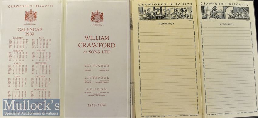Crawfords Biscuits & Chocolates - Desk Writing Set & Blotter etc for 1939 Sales Catalogue (In Edinburgh^ Liverpool & London). In three sections; The left section being a 28 page sales Catalogue illustrating in multi-coloured printing all the different types of Biscuits and Chocolates they sold with description and prices (here shown open at two of the pages)^ The centre section is the blotter and writing desk. The right section is the calendar with each page weekly headed by Arts and Crafts illustrations (Here shown closed). In grey imitation leather and gold tooling size when open 24" × 10¾". (In good clean almost new condition).