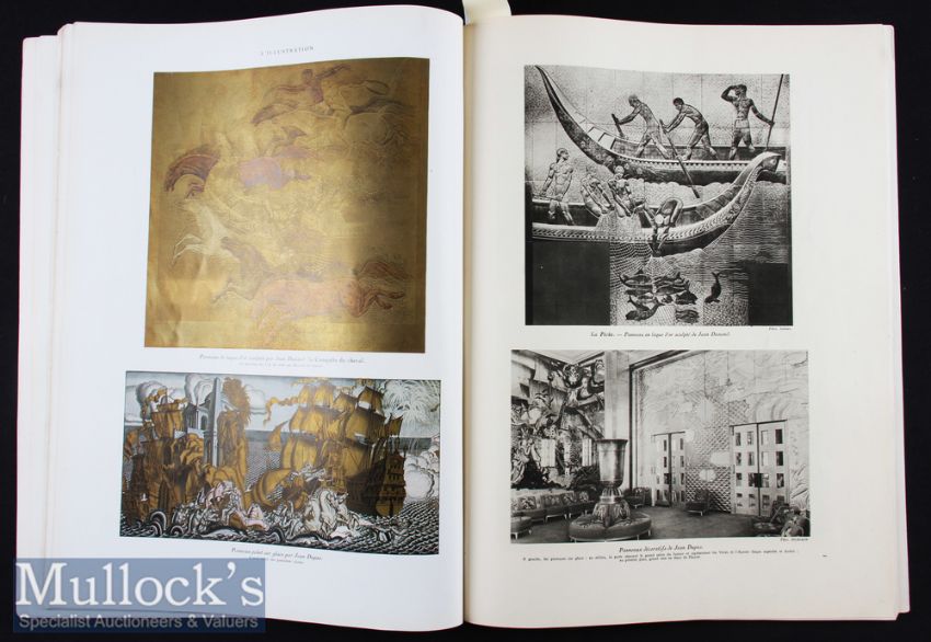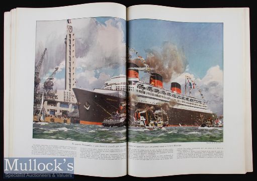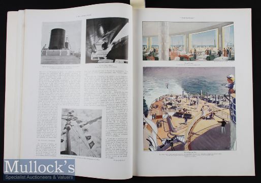 Maritime - “SS Normandie" The Most Beautiful Ocean Liner Ever Constructed Special Souvenir Publication issued at The Time of Her Maiden Voyage June 1935 - A large impressive 96 page publication by “L ‘Illustration" of 96 pages with 20 beautiful multi-coloured illustrations^ plus 9 large artist drawings in black/white on matt art paper^ also over 120 photographs. Has extensive detailing text. The largely Art Deco ship had some the finest of French design^ art work & huge Lalique glass of that period. Printed on quality semi-gloss paper plus a few pages of thick matt art paper. Bound in card cover with gold & embossing on front cover. Large size of 11¼" × 15" (285mm × 380mm).
