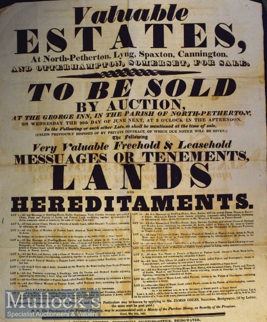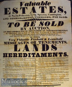 Somerset – Large Broadside 'Valuable Estates to Be Sold by Auction' At North-Petherton^ Lyng^ Spaxton^ Cannington and Otterhampton^ at The George Inn^ J. Binning Printer^ measures 45x55cm approx. heavy folds^ some tears along folds