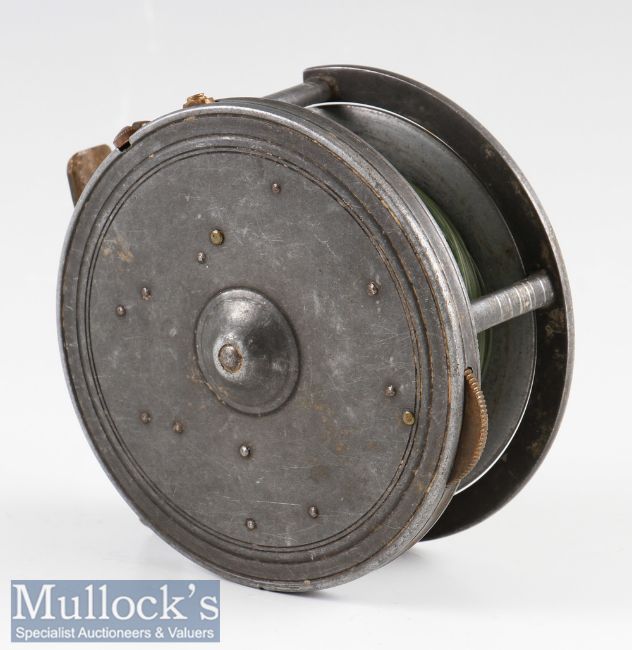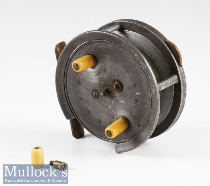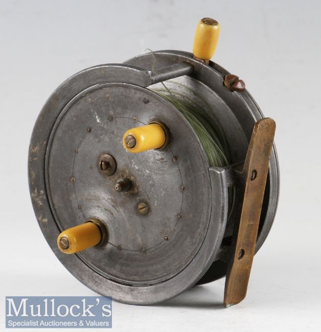 Dingley Silex style alloy casting reel made for Haynes Cork: 4" dia.^ with customised correct 1/4 rim cut – pillared drum core - smooth brass foot (small knock)^ 3x rim levers^ ivorine and brass rim brake lever broken - runs well and good sound check