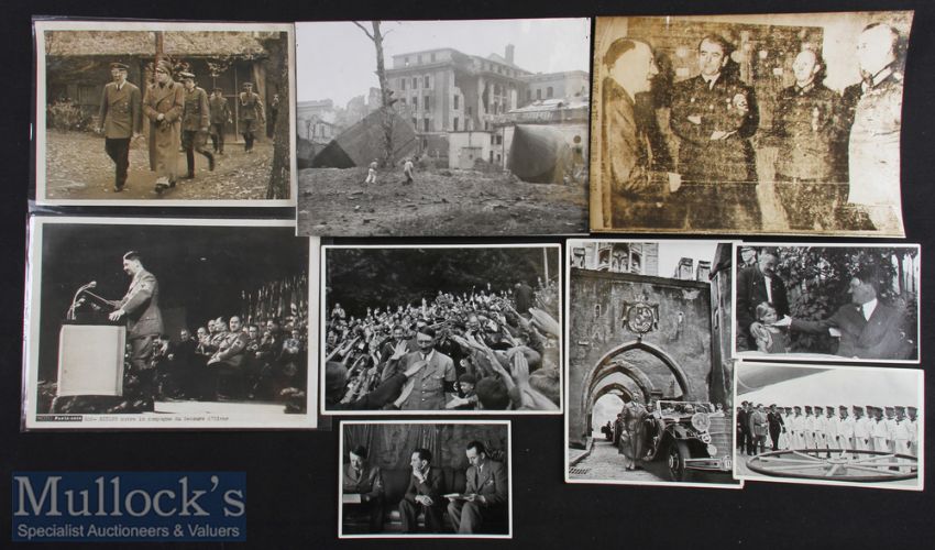 WWII Adolf Hitler Photographs including a selection of press photographs depicted with foreign minister Galeazzo Ciano^ Hitler’s demolished Reich Chancellery^ a Radio picture from Stockholm 9/1/45^ Hitler giving a speech blank to reverse^ plus a selection of smaller ‘Sammelwerk’ prints (9)