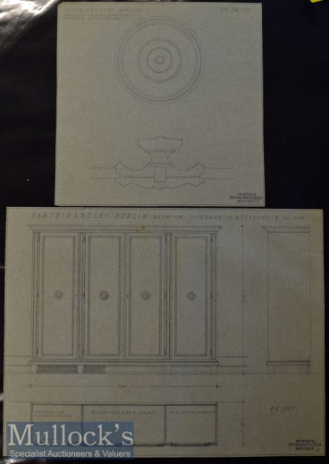 WWII – Adolf Hitler - Third Reich's 'Reich Chancellery' Unique Collection of Professor Heinr. Micha?lis^ München Marked Original 1941-42 Interior Design Plans for the Third Reich's 'Reich Chancellery' – the collection featuring various pieces of furniture and fittings. All plans entitled 'Partei-Kanzlei^ Berlin' [Party Office^ Berlin]^ most bear 'Professor Heinr. Micha?lis^ München' to bottom corner and consist of 'Arbeitszimmer des Reichsleiters^ Sessel' [Study of Reich Leader^ Armchair] PB17^ 1:1 scale^ measures 98x86cm approx.^ 'Arbeitszimmer des Reichsleiters^ Schreibtisch' [Study of Reich Leader^ Table with Marble Top] PB15 1:10 scale^ measures 60x45cm approx.^ 'Arbeitszimmer des Reichsleiters^ Schreibtisch' [Study of Reich Leader^ Writing Desk] PB14 1:10 scale^ measures 60x45cm approx.^ 'Arbeitszimmer des Reichsleiters^ Schrank' [Study of Reich Leader^ Cabinet] PB10 1:10 scale^ measures 60x45cm approx.^ 'Empfangszimmer des Reichsleiters^ Anrichte' [Reception Room of Reich Leader^ Sideboard] PK88 1:10 scale^ measures 60x45cm approx.^ (marks to top left) 'Empfangszimmer des Reichsleiters^ Wandtisch' [Reception Room of Reich Leader^ Wall Table] PK91 1:10 scales measures 60x45cm approx.^ 'Empfangszimmer des Reichsleiters^ Tisch' [Reception Room of Reich Leader^ Table] PK90^ 1:10 scale^ measures 60x45cm approx.^ 'Heizkörperverkleidung' [Radiator Cover] PK56 1:10 scale^ measures 60x45cm approx.^ 'Sitzungszimmer Runder Tisch' [Meeting Room Round Table] PK93 1:10 scale^ measures 60x45cm approx. plus 'Schreibtisch' [Writing Desk] 1:10 scale measures 45x34cm approx.^ (tear 8cm long from left edge inwards) 'Schrank' [Cabinet] 1:10scale^ measures 45x34cm approx.^ 'Schrank Rüsterholz' [Cabinet^ in Elm Wood] PK121 with 'Rosette und Knopf' [Rosette and Button] Door Knob PK121 measures 30x30cm^ 'Arbeitszimmer des Geschäftsführers^ Sofa' [Study of the Manager^ Sofa] PK141 1:10 scale^ measures 40x30cm approx.^ 'Rosette und Knopf' [Rosette and Button] Door Knob PK2 and PK10 1:1 scales^ measures 45x30cm approx.^ and another 'Persönl Referenten' [Cabinet] PK36 measures 45x30cm approx. Hand Drawn in pencil on tracing paper. Overall condition appears very good^ some small tears to edges in places^ other conditions noted above. The vendor''s father originally purchased these plans from a WWII veteran in Texas. (16)
