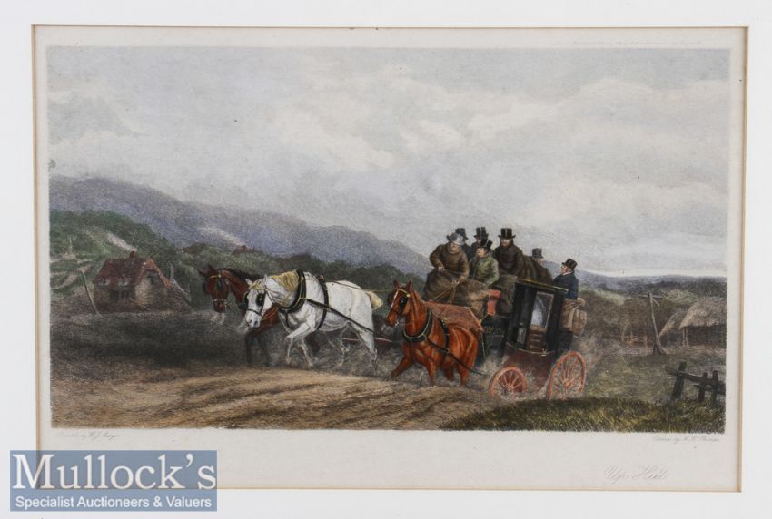 Hand coloured Etching ‘Up Hill’ Coaching Scene painted by W J Shayer^ etched by A H Phillips^ framed measures 39x29cm approx.