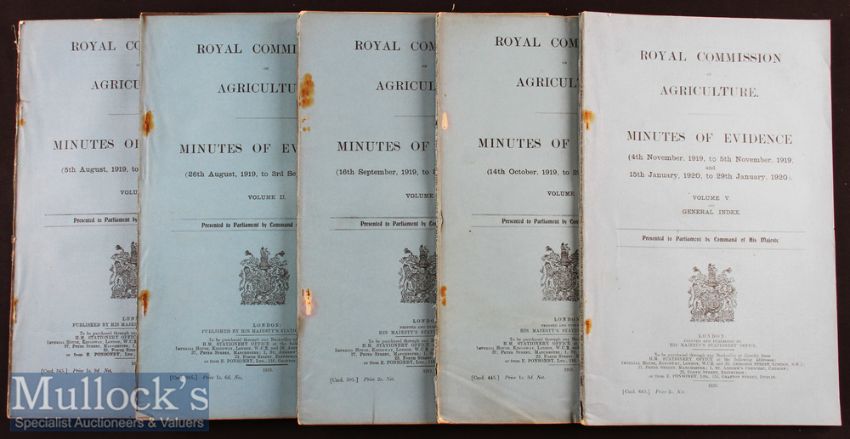 Royal Commission on Agriculture – Minutes of Evidence Vols I-V Documents HMSO 1919-1920 in original blue wraps^ staples rusted (5)