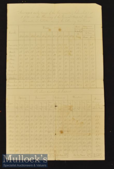 Average Temperatures recorded in manuscript for Valletta Malta 1820s – single sheet^ two tables neatly in hand^ a detailed record of the average temperature recorded at the hospital for the years 1820-1829. The higher table gives the average temperature per month whilst the lower table divides them into seasons.