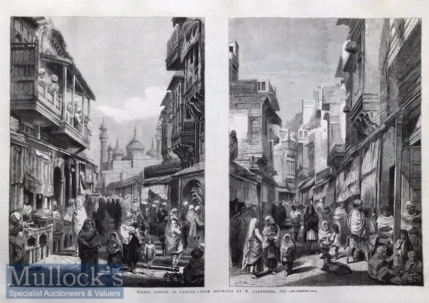 India and Punjab – Street Scenes in Lahore^ 1858 an original ILN wood engraving titled Street Scenes in Lahore 1858^ from drawings by W Carpenter. The engraving depicts a street scene and a busy market scene with a large domed building in the centre. Lahore was the capital of the Sikh Empire under Maharajah Ranjit Singh before it was annexed by the British Empire and made capital of British Punjab in 1849. Engraved dimensions (approx): 22.5cm x 34.5cm. Light ageing and foxing