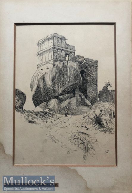 Original Victorian period published pen & ink drawing of Madan Mahal a Gond Fort near Jabalpur^ Madhya Pradesh^ India by John Pedder c1890. Illustration published in the book Picturesque India a handbook for European travellers by W S Caine by Routledge & Sons limited 1890. The artist John Pedder was a successful painter during the later 19th and earlier 20th centuries^ particularly noted for his landscapes. Housed in original mount & hand signed by the artist. Dimensions 33 x 23 cm