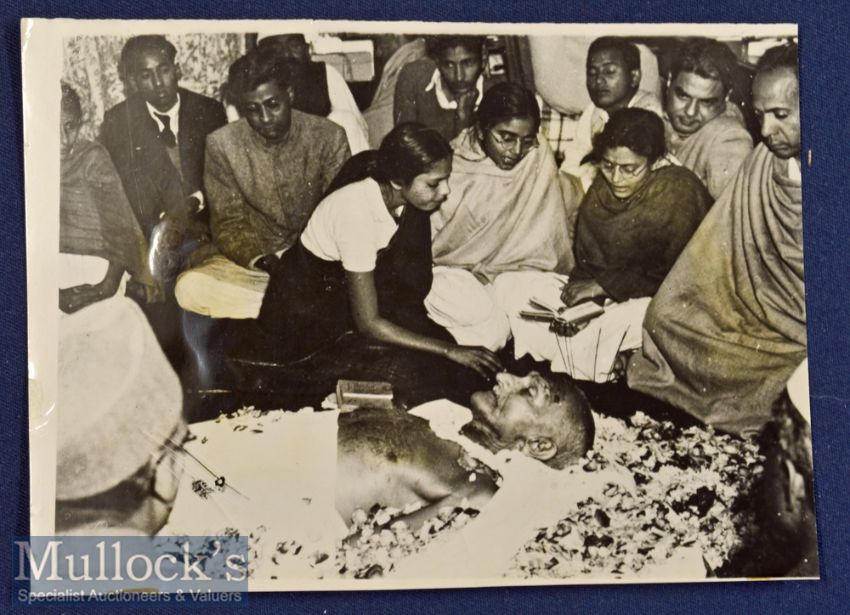 Mahatma Gandhi Funeral Original Press Photograph dated 2-2-48 with notes and stamp to reverse, a niece places flower petals on the brow of Mahatma Gandhi as he laid in state at Birla House, measures 17x12.5cm approx.