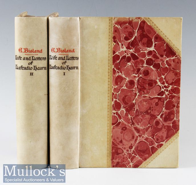 The Life And Letters Of Lafcadio Hearn by Elizabeth Bisland. Illustrated 1906 Books - Two Vol Set. 475 pages and 560 pages. The first true & comprehensive biography by his very close friend and fellow writer, Elizabeth Bisland. Hearn and Bisland often corresponded, even when he was in Japan. They carried on an extensive correspondence and long lasting friendship. Bisland knew Hearn like few others and was exceptionally capable of writing the first true and comprehensive biography of Hearn. This is by and large the best and most reliable of all Hearn biographies. Hearn referred to Bisland as his: "literary brother. Both Volumes; Bound in stunning unformed bespoke/privately bound quarter vellum binding with, black and red hand written ink titles to the spine with red marbled boards. Each size 6” × 8½”. Patrick Lafcadio Hearn 27 June 1850 – 26 September 1904), also known by the Japanese name Koizumi Yakumo, was a Greek-Irish writer who later became a naturalized Japanese citizen. He is best remembered for his books about Japanese culture, especially his collections of legends and ghost stories, such as Kwaidan: Stories and Studies of Strange Things. In the United States, he is also known for his writings about New Orleans, based on his decade-long stay there. In Japan, Hearn married a Japanese woman with whom he had four children. His writings about Japan offered the Western world a glimpse into a largely unknown but fascinating culture at the time