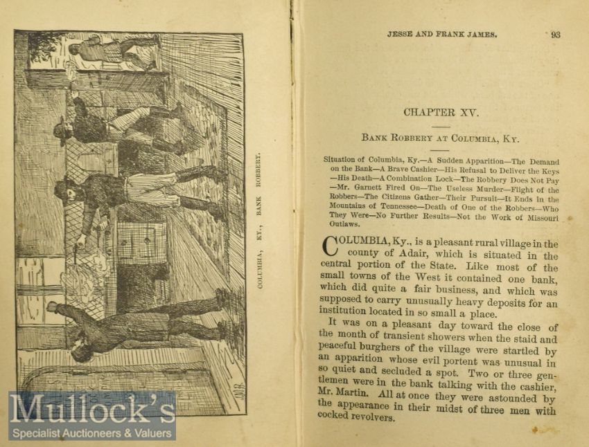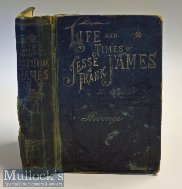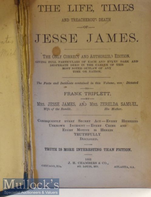 Americana - Jesse James – The Life, Times and Treacherous Death of Jesse James – The Only correct and Authorised Edition, the facts and incidents, dictated to Frank Triplett by Mrs Jess James and Zerelda Samuel, published by J.H Chambers & Co 1882 1st edition, 1st state (May 1882), 416pp, 27x illustrations present, one being on back of title page, lacks all pages proceeding title page including Jesse James Returning Home After a Raid 48 Chapters and epilogue. Condition poor, covers worn and scuffed, spine almost detached, spotting and foxing to pages especially page III and adjacent plate, worthy of cleaning and rebind, as extremely scarce. There is only one 19th C edition of this book issued in three states in 882, it is alleged that the book was suppressed by the Missouri Governor and many copies were destroyed.