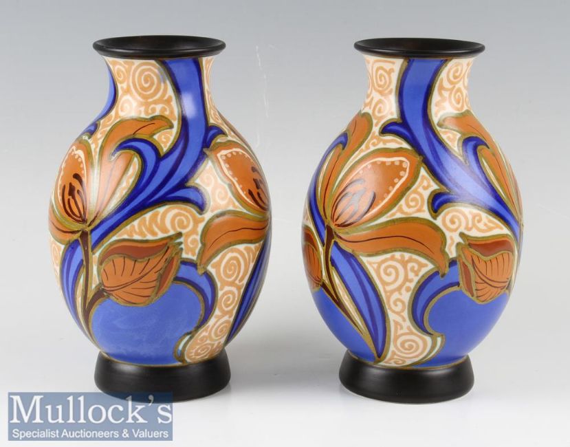 Pair of Plazuid Gouda, Holland Ceramic Vases with stylised leaf decoration, both marked to bases in good condition (2)