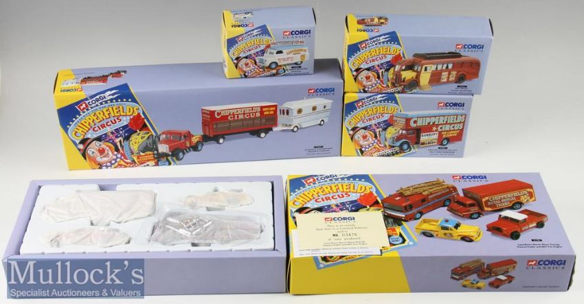Corgi Classics Chipperfields Circus Diecast Selection (5) incl 31703 Land Rover, Morris Minor Pick-Up, Thames Trader and AEC Fire Engine, 97885 Scammell Highway Trailer and Caravan, 97092 Bedford Pantechnicon Billy Smee Wardrobe, 97022 AEC Regal Living Quarters and 96905 Advance Booking Vehicle, all boxed (5)