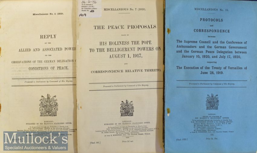 WWI United Kingdom Government Document – Report relating to the Treaty of Peace with Germany, Reply to the German Delegation on the Condition of Peace 1921 protocols and correspondence etc, respecting the Treaty of Versailles 1919 and The Peace proposals made by the Pope 1917, scuffed with staple rust marks (3)