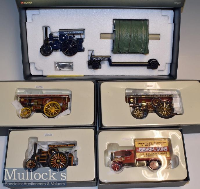 Corgi Diecast 80102 Fowler B6 Road Locomotive (Talisman) Low Loader & Cylinder Load - Pickfords plus 80101 Fowler B6 Showmans Locomotive, 80103 Fowler B6 Super Lion Showmans Engine 80104 Fowler B6 Road Locomotive Atlas, and 80202 Foden Flatbed Steamer with Liftvan all boxed (5)