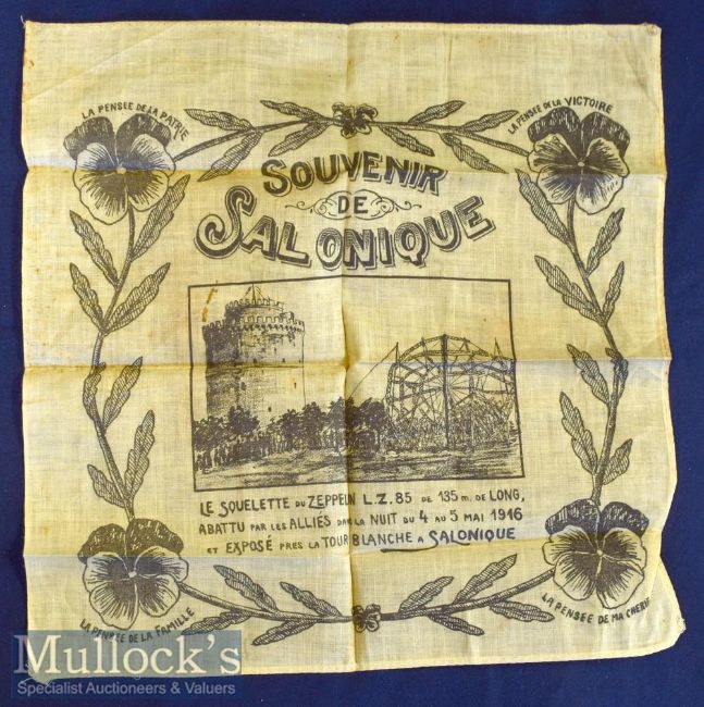 Shot Down Zeppelin Displayed At Salonika 1916 Interesting commemorative Cloth with illustration of the remains of the Zeppelin displayed along side the White Tower in Salonika. Printed on cloth size 13” ´ 13”.