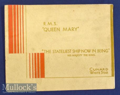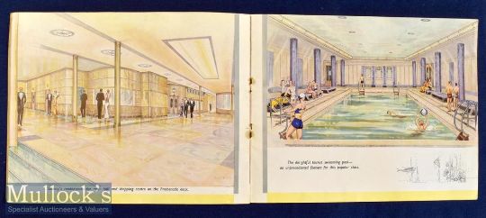 RMS Queen Mary “The Stateliest Ship Now In Being” Circa 1935-36 Brochure A very beautiful publicity Booklet of 12 pages of photographs of the intended attractive Art-Deco interior wall panels and designs as well beautiful multicoloured artists illustrations of the interior rooms of the ship. In imitation deco leather cover Large size of 9½” ´ 7½”. This attractive publication was produced and sent out to Cunards 1st Class and best regular customers while the ship was still being fitted out, hence artist illustrations of the interior and no photographs. Thus a Scarce publication.