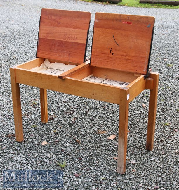 Vintage Children’s Wooden Double School Desk 92x61x46cm approx. with hinged lids providing storage below, 2x pen/ink wells