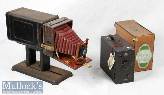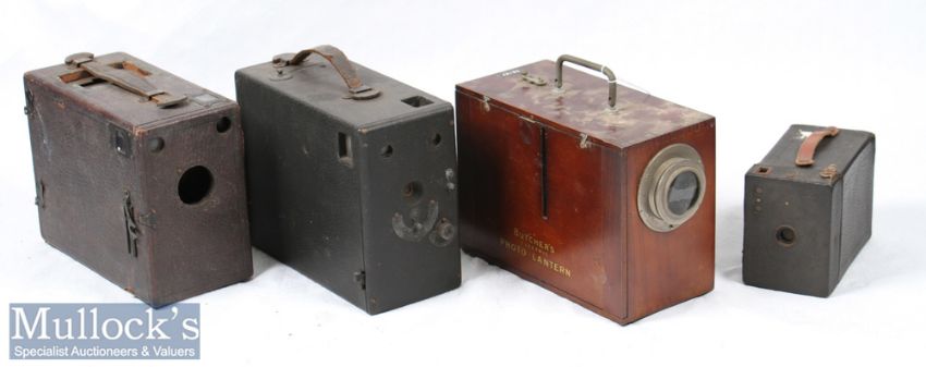 Butcher’s Electric Photo-Lantern c1920s in mahogany together with a Zeiss Ikon enlarger and foldout camera Pony Premo No15 with Anastigmat f4.5 lens, plus The Midge Box camera with Rectilinear Rapid lens, and 3x various box cameras in varying condition, lenses missing etc (6)