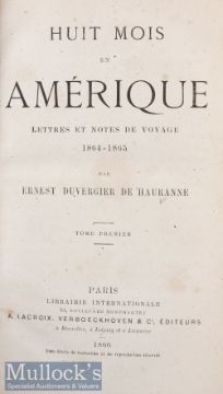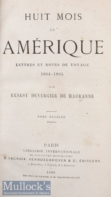 Americana / Civil War – Huit Moise n Amerique - Lettres et Notes de Voyage 1864-1865 Books by E Duvergier De Hauranne 1866, 2x Vols, 1st and only 19th c edition, in cloth covers, slight foxing. Both volumes with bookplate for Baron Holland of Holland House, London. The house was bombed out in the Blitz and the library severely damaged, the contents were sold off in 1947 (2)