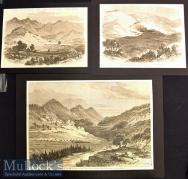 India & Punjab – The Campaign on the Punjab Frontier Engravings together with The Camp at Agore 35x25cm, The Village of Oghee 25x17cm and The Village and Fort of Dilboree 25x19cm c1868, tipped to card information to reverse (3)