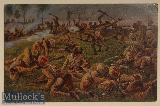 WWI Indian Military Postcard comic postcard showing Sikh regiments charging the German trenches c1914