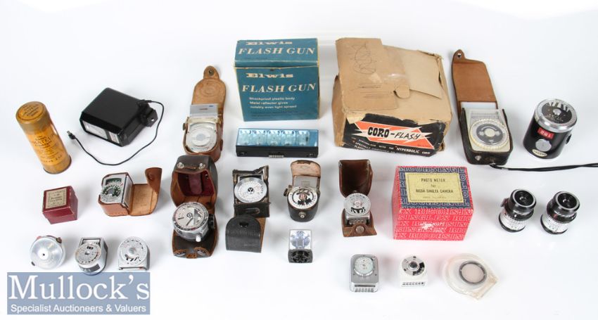Camera Accessories Selection includes clip on exposure meters such as Ricoh, Singlex cameras, Kopil TTL, Imperial, Bewi, Kodak Amateur Flashlight Outfit, Yashica 220 Flash, Voigtlander V200, Courtenay flash meter, Rollei flash, Starbltiz flash, Sylvania Flip-Flash, Fotoknip-selbstausloser, BDB SLR slide copier, Ohnar zoom slide duplicator etc (Qty) Box