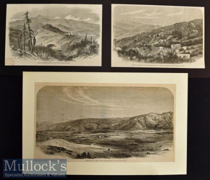 India and Punjab – The City of Lahore Original Panoramic Engraving 1857 showing troops with elephant entering the city, measures 43x11cm approx. with The Tomb of Runjeet Singh at Lahore 1858 17x15cm approx. and Sketches in the Punjab 1857 25x18cm all mounted (3), plus Three Original Engravings to include Abbotabad one of our Sanitariums in the Himalayas 1863 36x20cm, View of Murree 1863 24x16cm and Simla 1849 24x16cm, all tipped to card (6)