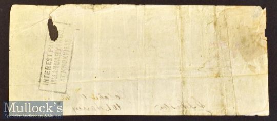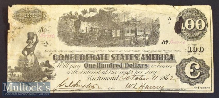 Confederate States Of America, Richmond 1862. Banknote for $100, Vignette of passenger Train of the period with Ship in background. Unusual as interest bearing at 2 cents per day, has frank stamp on reverse stating interest paid Knoxville Jan. 1863. Size 7¼” × 3¼”.