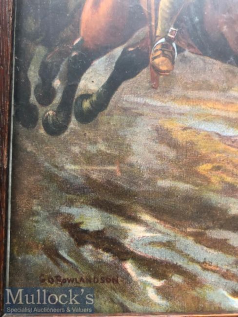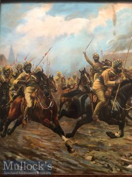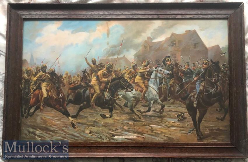 India – WWI Military Lithograph showing Sikhs of the Bengal lancers charge Germans at the battle of Neuve Chapelle, France c1915 housed in original maple wood frame. Signed by G D Rowlandson Dimensions 71 x 46 cm