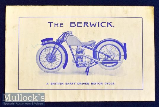 The Berwick “A British Shaft-Driven Motor Cycle” 1929 Sales Catalogue An 8 page Printers Proof sales Catalogue featuring 5 illustrations of the two machine being 247cc and 350 cc priced expensively at £60 and £61.10s. Folds out to size 9” ´ 23½“. Built to show at Olympia Motor Cycle Show this unusual lightweight Shaft Driven machine was a prototype that never went into production, Scarce thus.