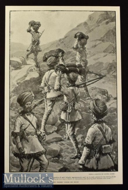 India - Pachyderms at Play The Bathing Season at the Zoo original large engraving published Sept 1880 after the painting by Bouverie Goddard 50x33cm laid to card. B Goddard 1832-1886 was a renowned animal painter whose original paintings command high prices together with A Night Picket Going on Duty original illustration 1898 by J Nash RI shows the 36th Sikhs during the Tirah Expedition 25x16cm laid to card (2)