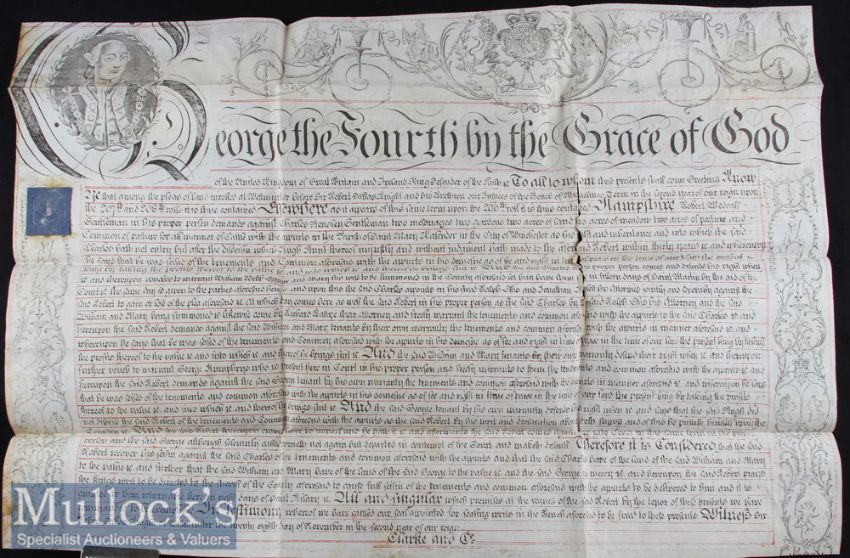 Property In Winchester, Hampshire. Fine Portrait Of King George IV On This Exemplification Of Recovery. 1822 - An impressive Estate Recovery with finely engraved portrait of King, Royal Arms and Allegorical Figures across the top. The text manuscript is clearly written within the red lines. Document before Court of Pleas. It is between Robert Medcalf and Charles Hensley concerning Land and Property in Winchester, Hampshire. On Vellum, size 31 ½” × 21¾”.