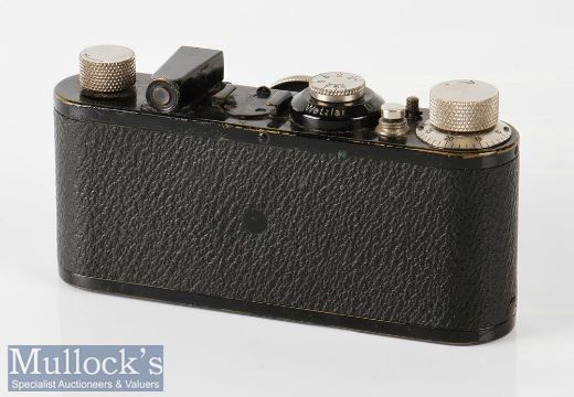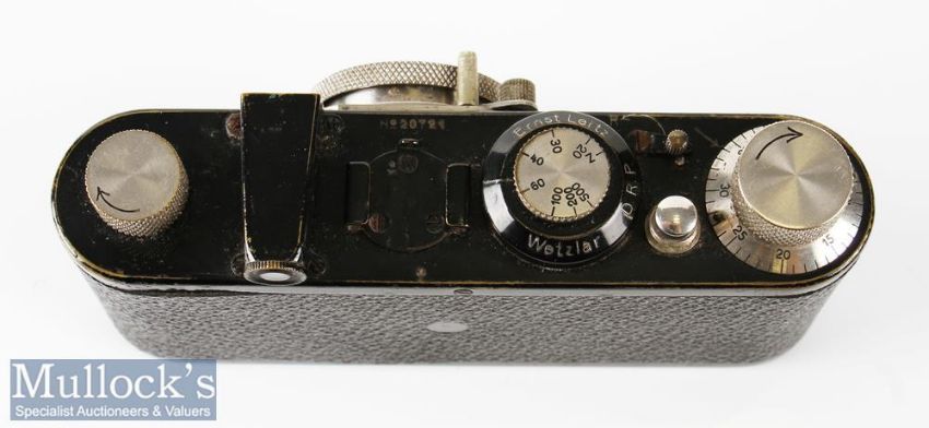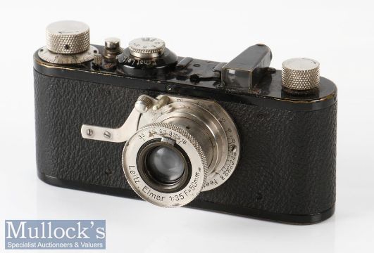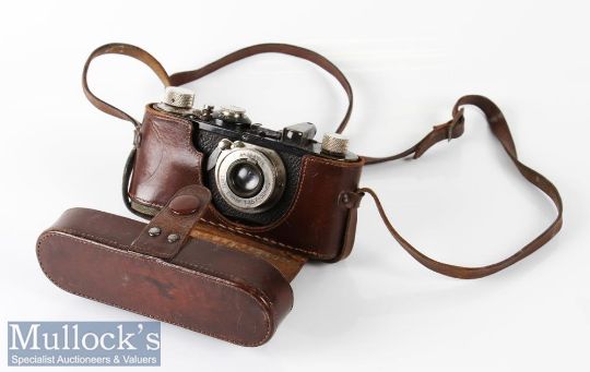 1929 Leica I 20721 camera with Leitz Elmar 1:3,5 f=50mm lens appears with age related wear, with makers leather case and strap