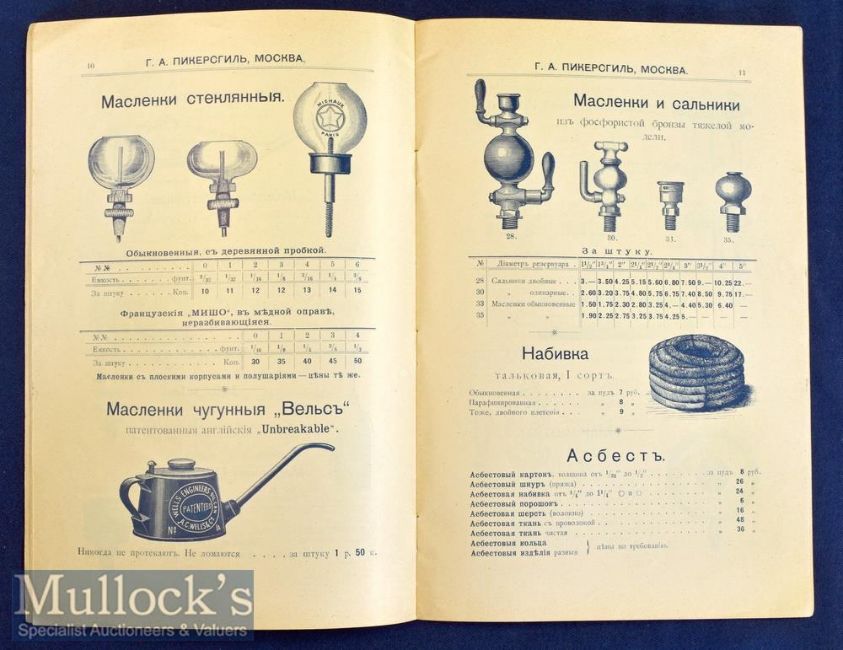 Russia – Trade Catalogue 1900 - Pickerings Moscow 1900 This is a very unusual trade catalogue, for ironmongery items, valves and factory tools and equipment. Pickering, from Scotland originally, moved to Russia. Interesting 28 pages illustrated on most pages, Printed on fine semi-gloss paper in card cover size 6¼” ´ 9¼”