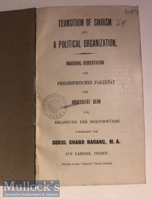 India - Transformation of Sikhism into a Political Organisation a political power by Gokul Chand Narang rare title printed at the tribune press Lahore, 1st Edition c1912 many chapters detailing the Sikhs rise to political power in the Punjab.