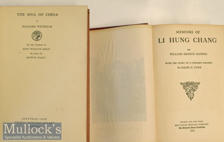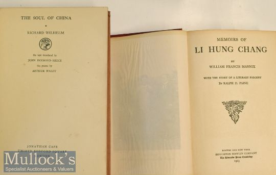 China History – Memoirs of Li Hung Chang Book 1923 by W.F. Mannix with story of literary forgery by R. D Paine, Houghton Mifflin, red cloth originally published in 1911 by Mannix later proved a forgery plus The Soul of China by R. Wilhelm 1928, cover faded, ex-University stamp (2)