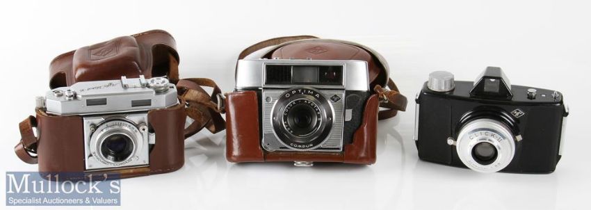 Agfa Karat 36 rangefinder camera Agfa solinar 1:2,8/50 synchro-compur with leather case and strap plus Agfa Optima Compur color – apotar S with leather case and Agfa Click II achromat 1:88 in case (3)
