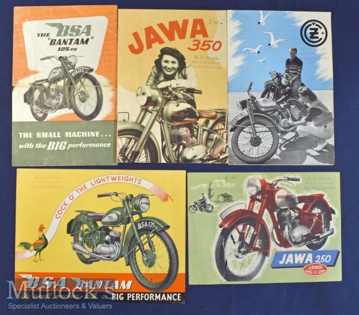BSA Bantam 125 cc 1949 Brochure A 4 page brochure illustrating and detailing with prices this Motor Cycle for £60 plus tax. Made in Birmingham. Printed on semi-gloss paper, size 5½” × 8½” plus another and a Jawa Motor Cycle 1950-60s (5)